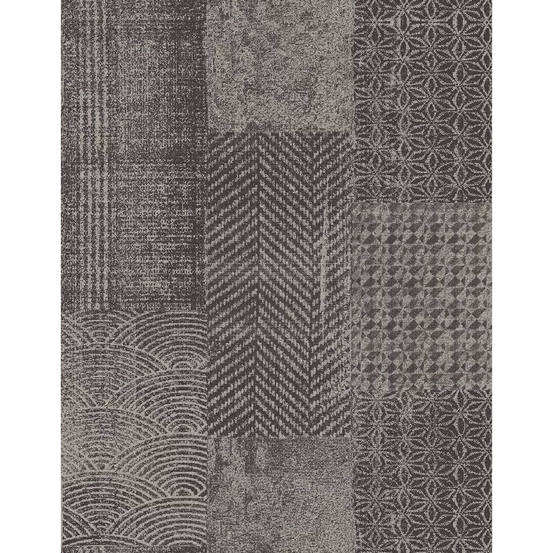 Transform your space with the bold, sophisticated style of our Modern Industrial Patchwork Wall Mural. This stunning custom-fit wallpaper features a complex, layered design that mimics a geometric patchwork of rich textures, including chevron, subtle wave patterns, and distressed finishes in a deep, versatile charcoal gray and soft black palette.