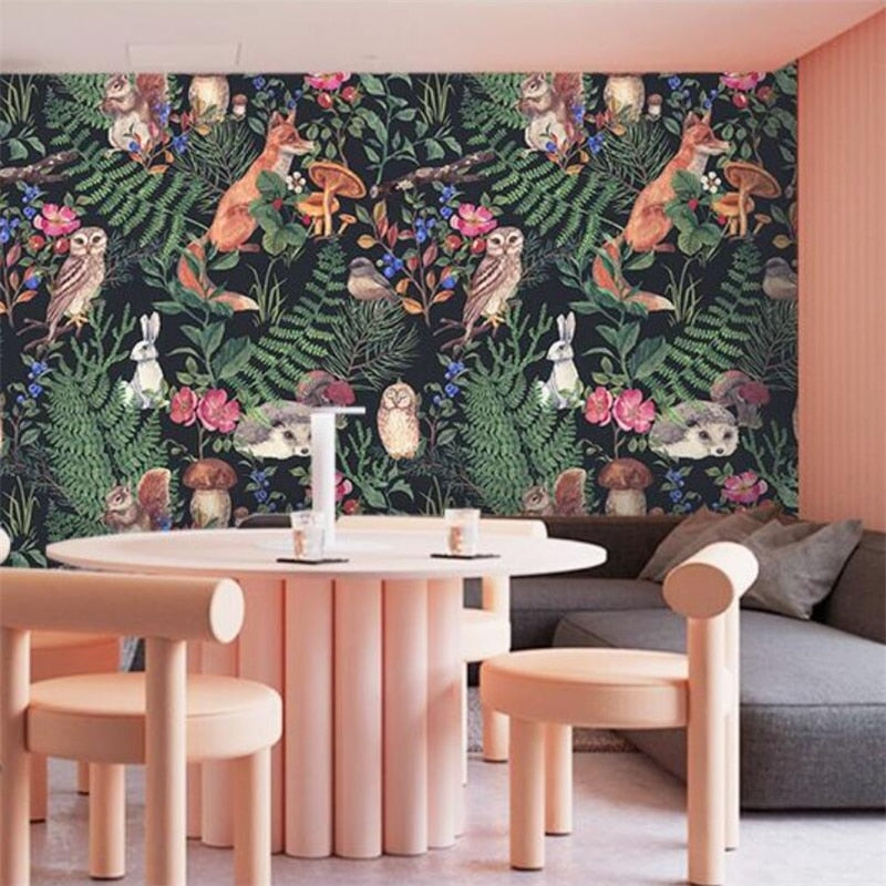 Custom Wallpaper Mural Owl Fox Hedgehog and Plants (㎡)