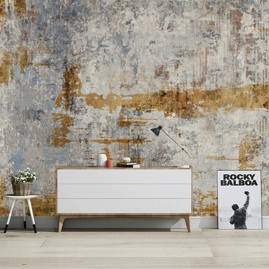 Featuring a captivating interplay of muted greys, warm golden ochre, subtle blues, and creamy whites, this mural creates a dynamic visual texture that mimics aged plaster, concrete, or weathered industrial surfaces. The abstract brushstrokes and distressed effects add depth and character, making your wall a true work of art.